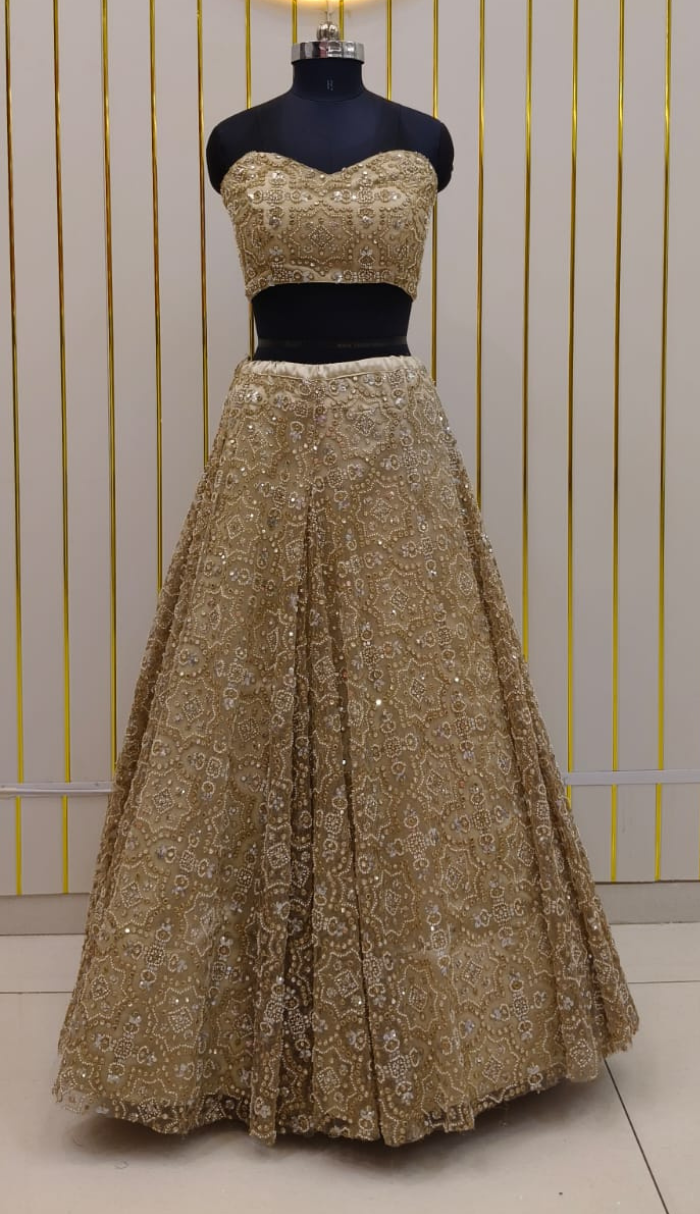 Elegant champagne lehenga set with delicate embroidery and a flowy silhouette, perfect for festive and special occasions.